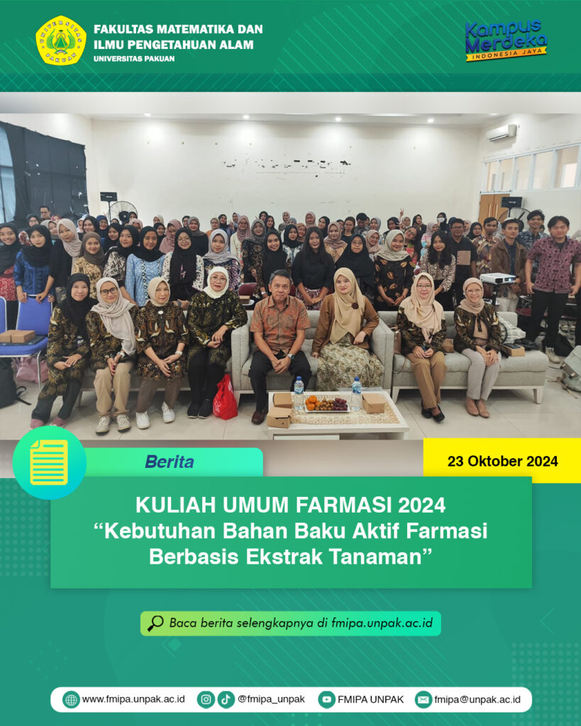 Kuliah Umum Farmasi 2024: Kebutuhan Bahan Baku Aktif Farmasi Berbasis Ekstrak Tanaman Prodi Farmasi FMIPA Universitas Pakuan kembali mengadakan kegiatan Kuliah Umum Farmasi yang berlangsung pada Rabu, 23 Oktober 2024 dengan mengangkat tema penting: “Kebutuhan Bahan Baku Aktif Farmasi Berbasis Ekstrak Tanaman.” Acara ini diikuti oleh 110 mahasiswa, dengan tujuan meningkatkan wawasan dan pemahaman mengenai potensi dan tantangan pemenuhan bahan baku farmasi […]
