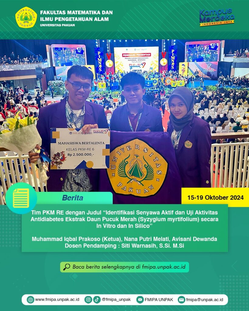 Tim PKM RE Universitas Pakuan Raih Penghargaan Mahasiswa Bertalenta Kategori PKM RE Berkat Penelitian Antidiabetes dari Ekstrak Daun Pucuk Merah (Syzygium Myrtifolium) Bogor, 19 Oktober 2024 – Tim Program Kreativitas Mahasiswa Riset Eksakta (PKM-RE) Universitas Pakuan yang terdiri dari Muhammad Iqbal Prakoso (Ketua), Nana Putri Melati, dan Avisani Dewanda, di bawah bimbingan Dosen Siti Warnasih, […]