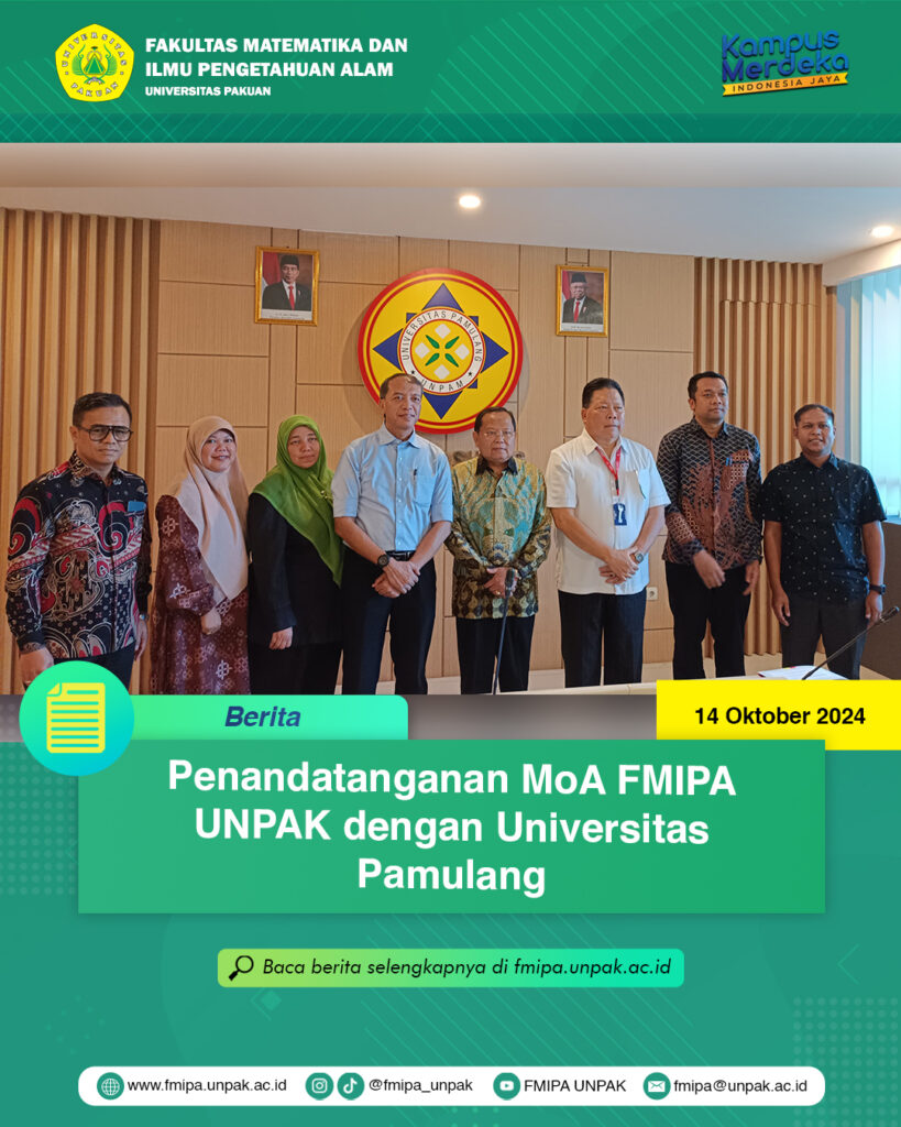 Penandatanganan MoA FMIPA UNPAK dengan Universitas Pamulang Pada hari Senin, 14 Oktober 2024, FMIPA Universitas Pakuan mengadakan acara penandatanganan PKS (Perjanjian Kerja Sama) dan dokumen implementasi MoA di Universitas Pamulang. Acara yang dimulai pukul 09.00 ini bertujuan untuk memperkuat kerja sama antara Program Studi Ilmu Komputer dan Matematika FMIPA UNPAK dengan Universitas Pamulang, khususnya dalam bidang […]